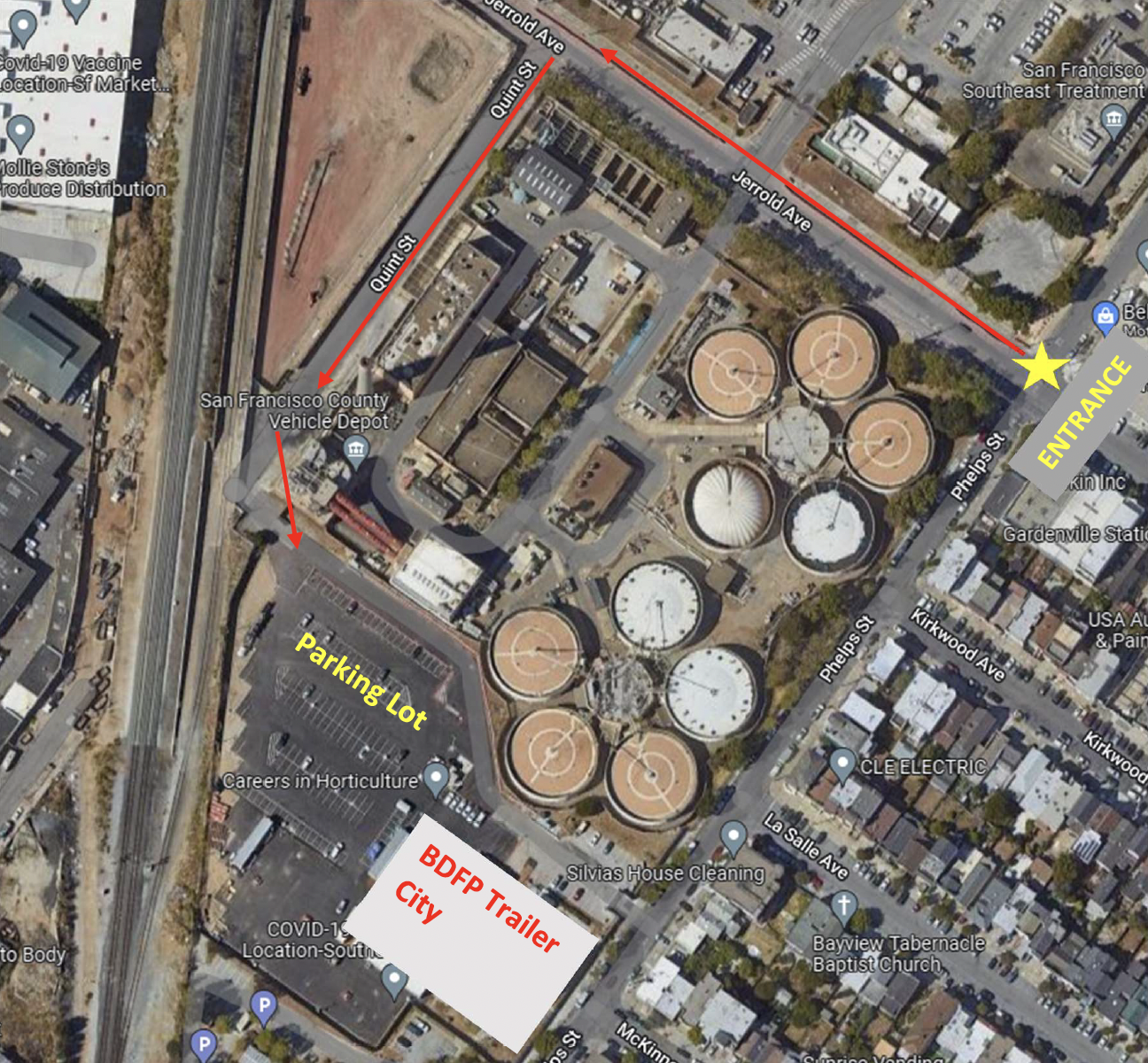 There is a security gate at the intersection of Phelps Street and Jerrold Avenue that all visitors must pass before entering the jobsite. Then go down Jerrold Avenue and turn left on Quint Street to reach the BDFP parking lot. The MWH/Webcor trailer is located next to the parking lot.